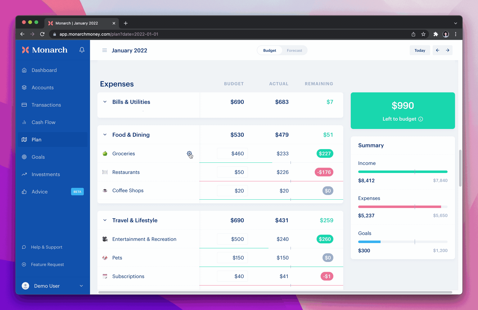 Sometimes you know exactly the amount you want to budget for a category: rent, mortgage, or even Netflix. Other times the budget is an approximation, you don’t know the exact dollar amount in advance: restaurants, groceries, or entertainment. For those approximate categories you can now turn them into rollover budgets. A rollover means that any budget left at the end of the month will carry forward into the next month. There are all sorts of use cases for this: